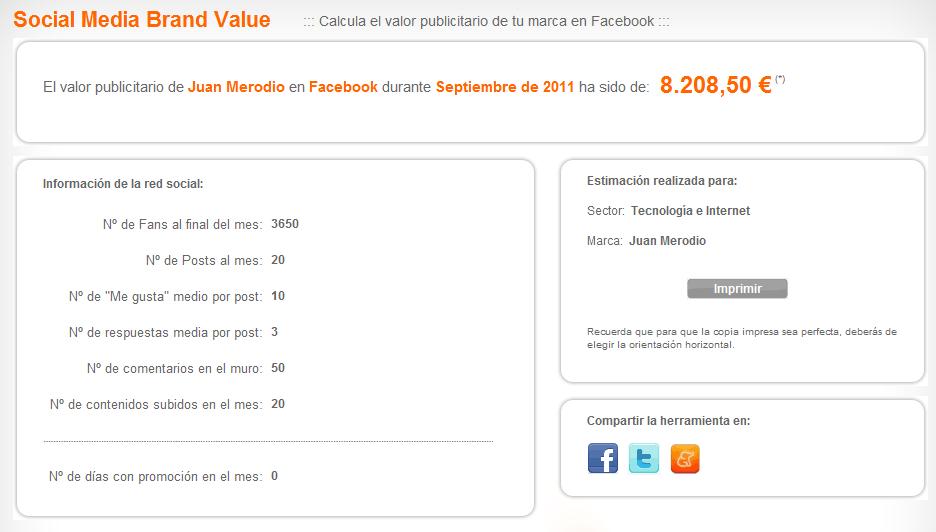 Para calcula el valor de tu marca debes entrar en www.social-media-brand-value.com, y para hacer una prueba de la herramienta he calculado el valor publicitario de mi página de fans y los resultados son: