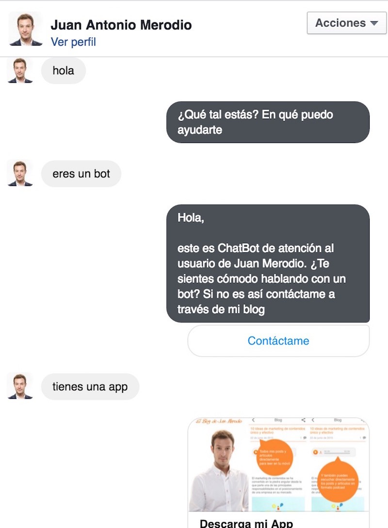 Aquí puedes ver una captura de un bot muy sencillo que he creado en mi página de fans de Facebook: