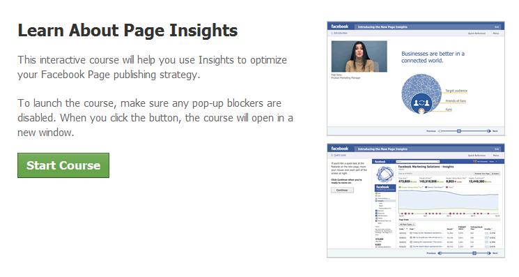Facebook acaba de lanzar un pequeño curso online interactivo (en inglés) de la mano de su Responsable de Marketing de Page Insights, donde en formato video nos cuenta distintas estrategias para que mejoremos la gestión de nuestras páginas de fans basándonos en las analíticas que Facebook nos ofrece.
