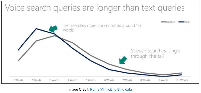 Las famosas palabras clave que utilizábamos y utilizamos para posicionar no pueden ser las mismas palabras clave para las resultados por voz, ya que como decíamos las búsquedas por voz suelen ser mucho más largas tal y como puedes ver en la siguiente imagen.