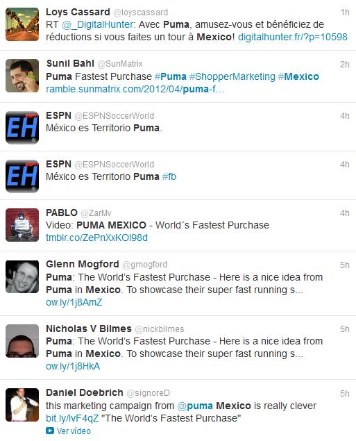 Esta es la idea que la marca PUMA ha puesto en marcha en sus tiendas de México bajo el lema «The world’s fastest purchase», donde nada más entrar sacas un ticket que registra el tiempo que pasas en la tienda hasta que compras un producto y cuanto antes lo compres más barato te saldrá, concretamente se ha realizado para promocionar las nuevas zapatillas «Fass 500».